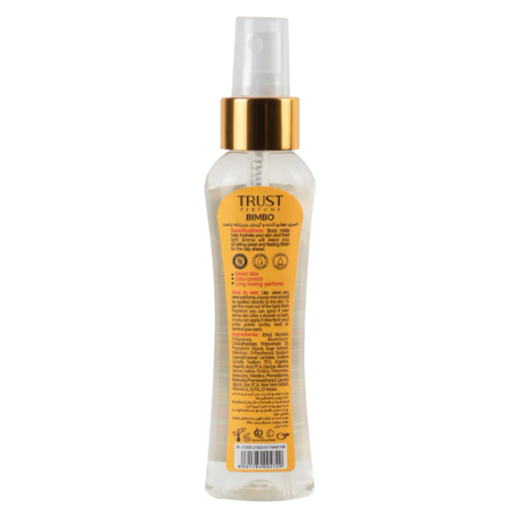 بادی میست زنانه تراست مدل Bimbo با گروه بویایی شیرین، وانیل، و میوهای در اختیار شما قرار میگیرد. با نتهای اولیه از انگور فرنگی و گلابی، این بادی میست با یک شروع شیرین و میوهای به شما خوشآمد میگوید.