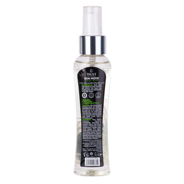 بادی میست مردانه تراست مدل Bon Motif با حجم 100 میل و رایحهای میوهای و خنک به شما ارائه میشود. نتهای اولیه آن شامل ترکیبی تازه از آناناس، انگور سیاه و سیب سبز است و با هم طوری ترکیب شدهاند که حس خنک و میوهای را برای شما ایجاد میکنند.