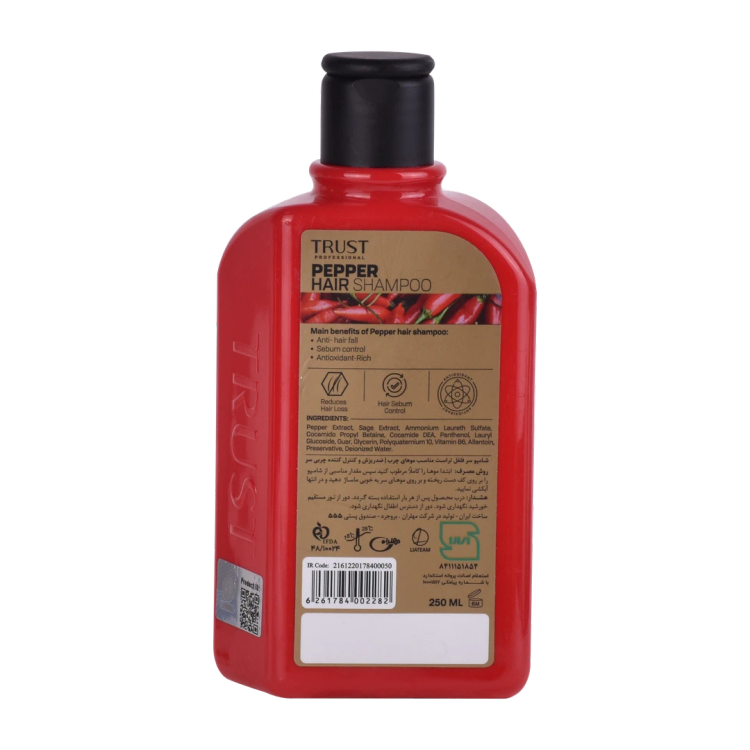 عصاره فلفل موجود در شامپو سر فلفل تراست، با تحریک فولیکولهای مو، به رشد بهتر مو و افزایش سلامت آن کمک میکند. علاوهبراین با افزایش گردش خون در پوست سر، از ریزش تارهای مو پیشگیری میکند. همچنین این محصول با داشتن عصاره مریمگلی در ترکیبات خود، ضمن کنترل چربی پوست، باعث براق شدن مو و رنگپذیری موهای خاکستری و بیرنگ میشود.