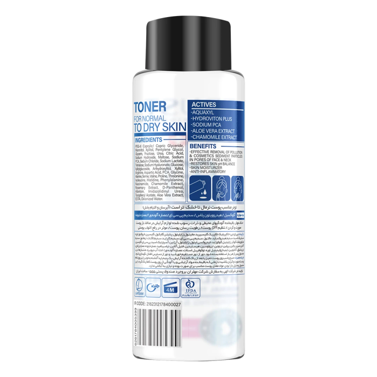 تونر مناسب پوست نرمال تا خشک تراست، با داشتن ماده آکواکسیل در ترکیبات خود، پوست را آبرسانی کرده و با ایجاد یک سد دفاعی روی پوست، مانعِ از دست دادن آب پوستی میشود. هیدروویتون پلاس در این محصول، مرطوبکننده قوی پوست بوده و سدیم پی سی ای این تونر از خشکی پوست جلوگیری میکند. همچنین عصاره بابونه در این ترکیب از آسیب رادیکالهای آزاد به پوست جلوگیری کرده و عصاره آلوئهورا التهابات پوستی را کاهش میدهد.