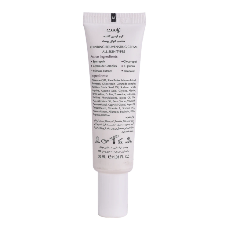 کرم ترمیم کننده تراست مناسب ترمیم پوستهای آسیبدیده و درمان انواع آسیبهای پوستی است. مواد مؤثره موجود در این کرم باعث تحریک به تکثیر سلولهای پوستی و ترمیم آسیبهای واردشده به پوست میشوند؛ این کار را نیز با افزایش انقباض عضلات اطراف ناحیه آسیبدیده، کمک به جمع شدن زخمها و بهبود سریعترشان انجام میدهند. وجود ترکیبات فعال گیاه براسیکای این محصول، از رشد باکتریها و قارچها جلوگیری کرده و از طریق اولیگوگالاکتومانان جلوی التهاب، قرمزی، خارش و سوزش پوست در ناحیه آسیبدیده را میگیرد. همچنین مصرف این کرم با داشتن ترکیبات فعال سرامیدی به آبرسانی پوست هم کمک میکند.